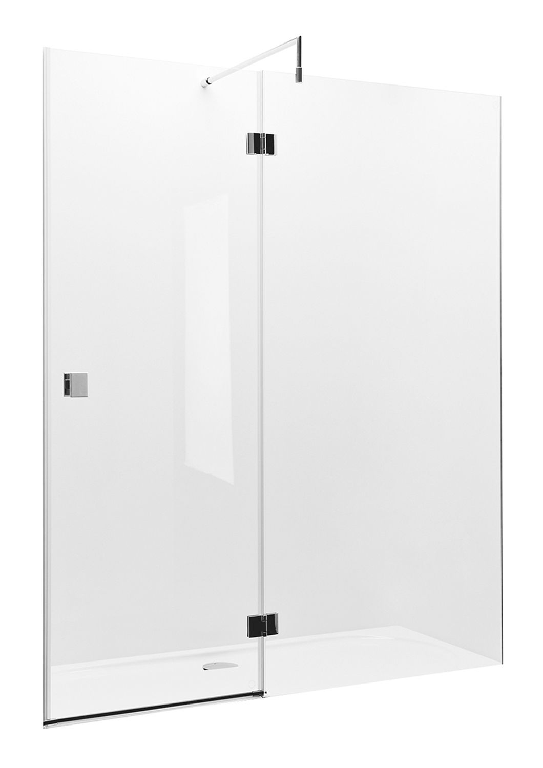 Прозрачное закаленное стекло толщиной 8 мм с гидрофобным покрытием MaxiClean. Хромированные алюминиевые профили, хромированные латунные петли и ручки. Возможен монтаж без душевого поддона.