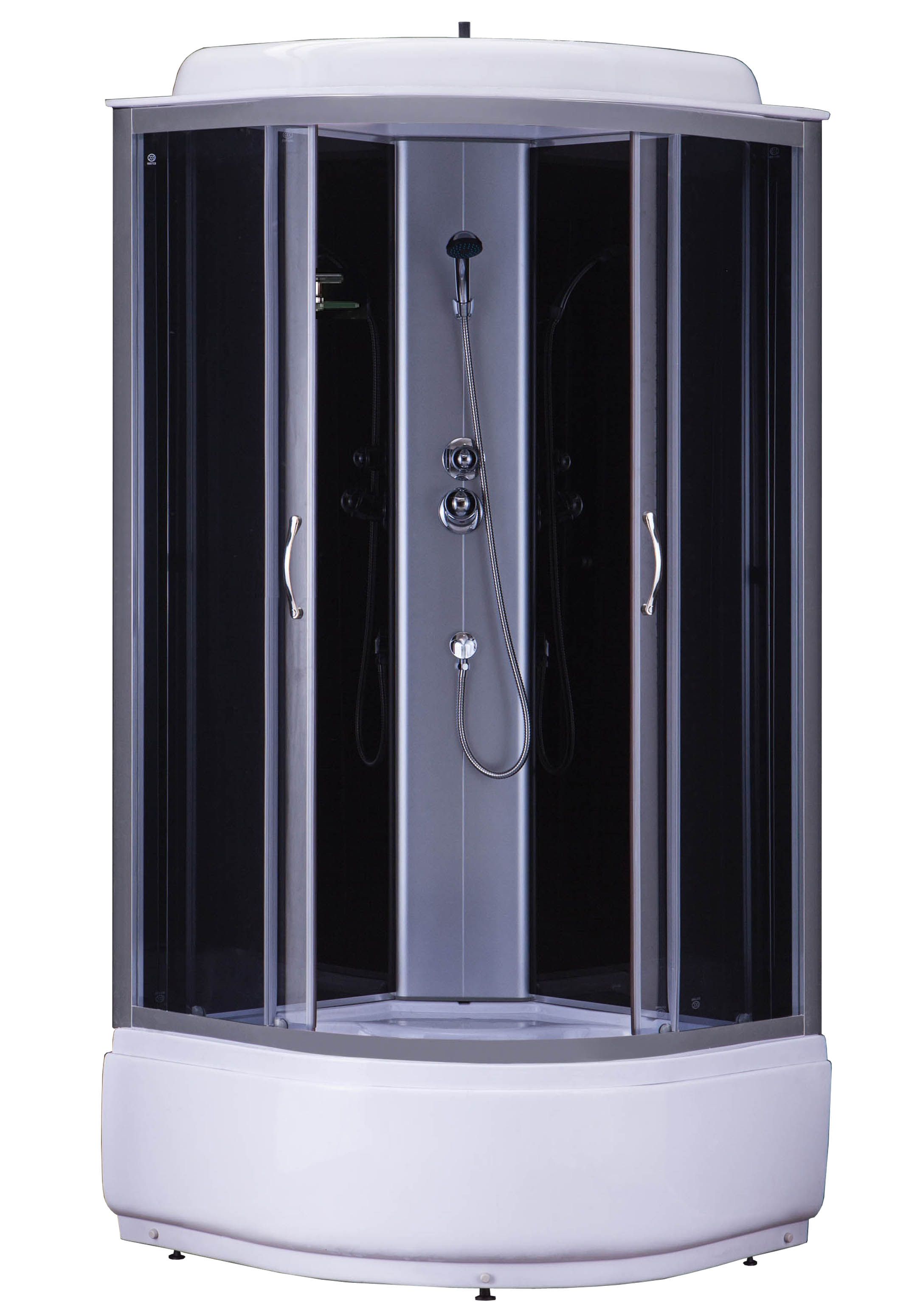 Душевая кабина 900×900×2150 мм — идеальное решение для современного санузла с угловым монтажом. Конструкция оснащена двумя раздвижными дверями из прозрачного закаленного стекла толщиной 4 мм, обеспечивающими удобный доступ и визуальную легкость. Высокий поддон высотой 40 см выполнен из прочного ABS-пластика, что гарантирует долговечность и устойчивость к повреждениям. Задние стенки изготовлены из стильного черного стекла, придающего кабинке элегантный и современный вид. Алюминиевый профиль цвета сатин обеспечивает надежность конструкции и гармонично дополняет общий дизайн. В комплект входит верхний душ и смеситель с ручным душем, что позволяет наслаждаться комфортным и разнообразным водным потоком. Эта душевая кабина сочетает в себе качество, функциональность и эстетическую привлекательность.