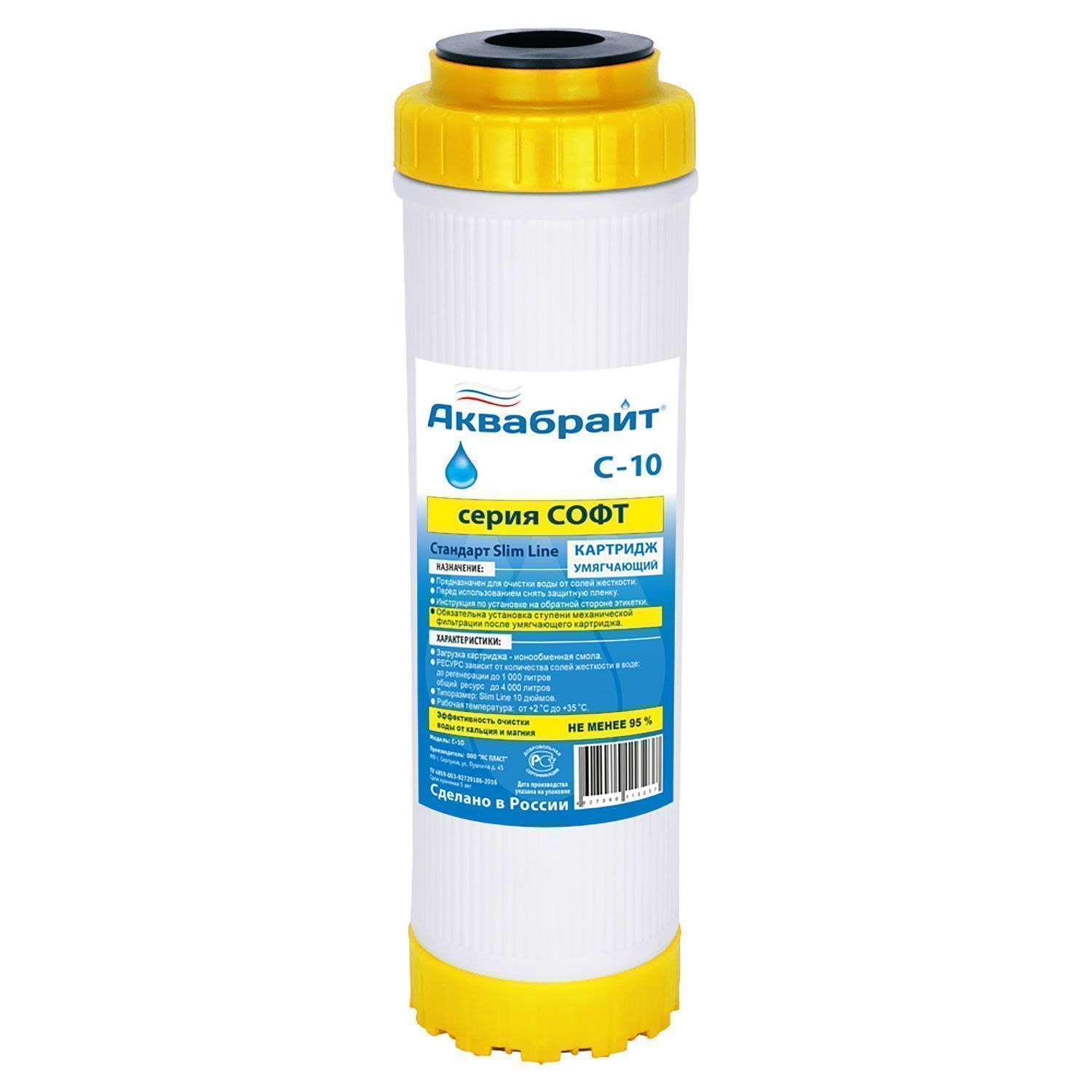 С-10, Картридж для умягчения воды АКВАБРАЙТ. Наполнитель из ионнообменой смолы (с возможностью регенарации). Типоразмер SLIM 10". Ресурс до 4000 литров (зависит от качества воды).