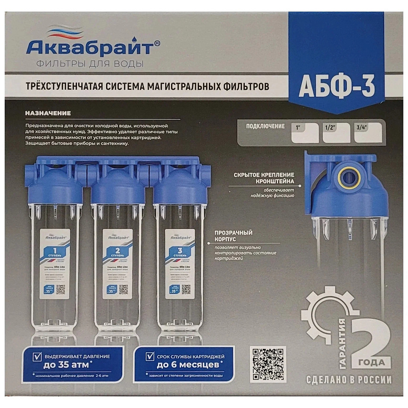 АБФ-3 1/2, Трехступенчатый  магистральный  фильтр АКВАБРАЙТ стандарт SLIM LINE. Прозрачные корпуса. Рабочее давление от 2  до 6  атм. Подключение ЛАТУННАЯ ВСТАВКА  1/2 дюйма. Кронштейн и ключ в комплекте.