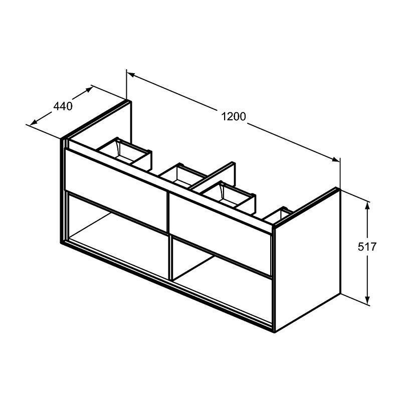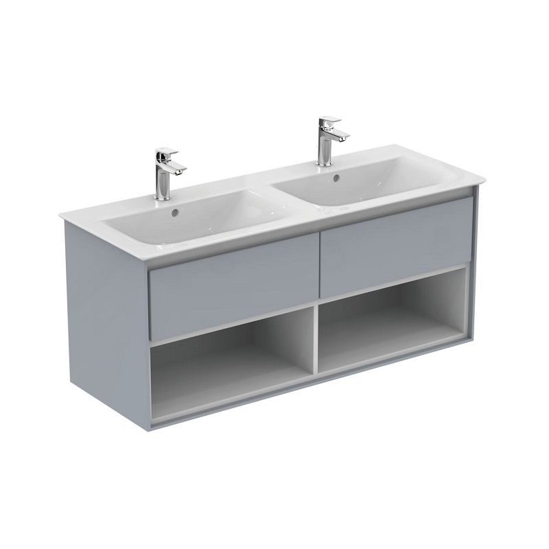 CONNECT AIR Тумба для раковины 120 см для подвесного монтажа, с 2-мя ящиками, система плавного закрытия, с открытым пространством для хранения под ящиками, с крепежом. Для монтажа с раковиной Connect Air Vanity 124 см E027301 или раковиной-чашей Connect Air 40 см E034701 (2 шт.) со столешницей E0852 или раковиной-чашей Connect Air 60 см E034801 (2 шт.) со столешницей E0852. Рекомендуется сифон Space Saving EE23033967 (заказывается отдельно) Glossy Light Grey + Matt White (Светло-серый глянцевый + Белый матовый)