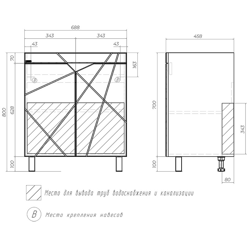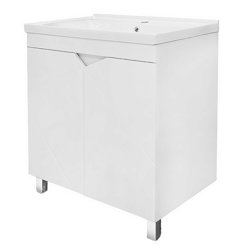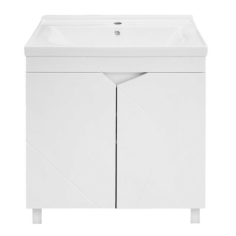 Модели одного комплекта (набора) мебели Оптимум выполнены в едином архитектурно-художественном и конструктивно-технологическом решении. Фасады имеют геометрическую фрезеровку с встроенной ручкой. Классический конструктив тумб под раковину с двумя дверцами и полкой позволяет удобно разместить бытовую химию, косметические средства и все необходимое.