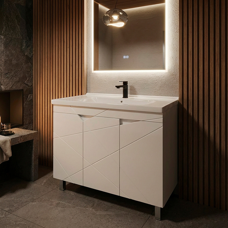 Модели одного комплекта (набора) мебели Оптимум выполнены в едином архитектурно-художественном и конструктивно-технологическом решении. Фасады имеют геометрическую фрезеровку с встроенной ручкой. Классический конструктив тумб под раковину с двумя дверцами и полкой позволяет удобно разместить бытовую химию, косметические средства и все необходимое.