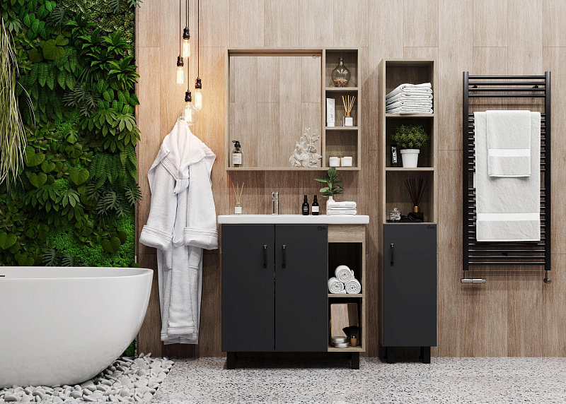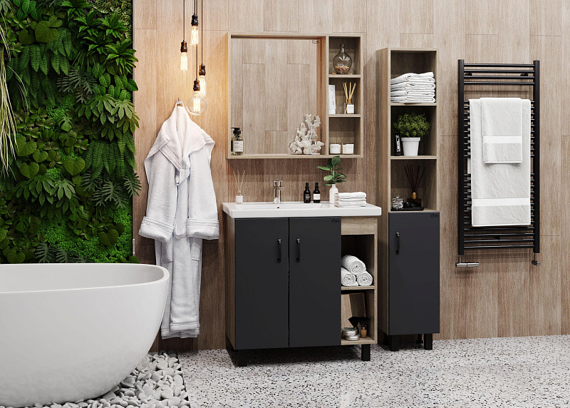 В тумбе Onika ТИМБЕР 80.01 удачно сочетаются контрастные цвета и фактуры: серый матовый фасад с покрытием SoftTouch, корпус цвета дуба с роскошной текстурой, черная матовая металлическая фурнитура.