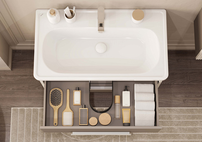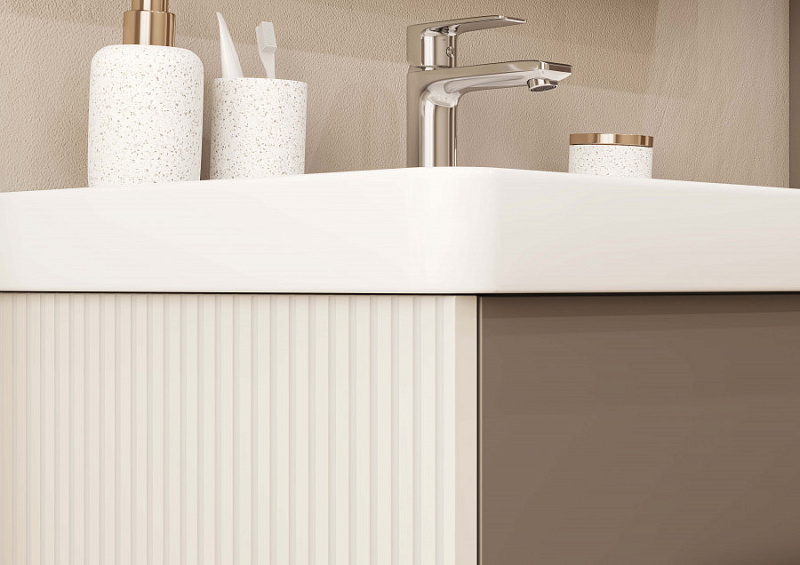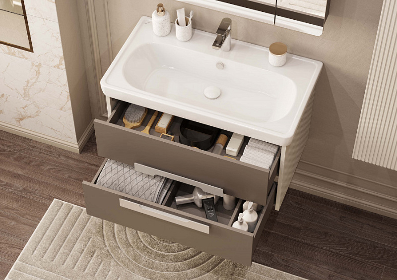 Тумба под раковину выполнена из высококачественной МДФ, покрытой матовой пленкой. Вертикальная фрезеровка на боковинах создает эффект визуального увеличения высоты изделия, придавая ему элегантность и изящество. В тумбе есть два вместительных ящика с эргономичной организацией пространства, которую можно настроить по своему удобству. Ящики открываются при помощи удобной ручки, а благодаря направляющим с доводчиками обеспечивается плавное закрывание, что гарантирует бесшумность и комфорт использования мебели. Данная тумба комплектуется раковиной Santek Нео Классик.