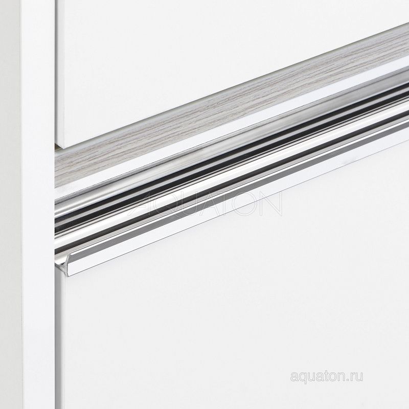 Верхний ящик открывается с помощью системы push-to-open, а нижний – за изящную удобную профильную хромированную ручку. Над ручкой установлена вставка из влагостойкой ламинированной плиты благородного цвета дуб наварра.