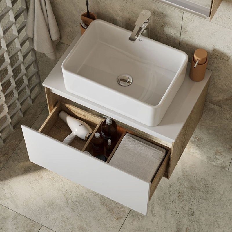 Ящик открыввается одним нажатием, так как оснащены механизмом Push-to-Open, гарантирующим плавное открывание и закрывание. В тумбах с ящиками размером от 70 см предусмотрена регулируемая система хранения, которая позволяет организовать пространство внутри ящика максимально эффективно. Это обеспечивает комфортное хранение вещей в ванной комнате.