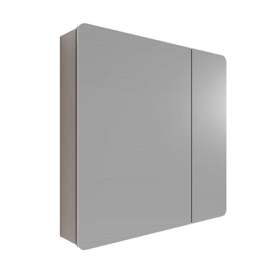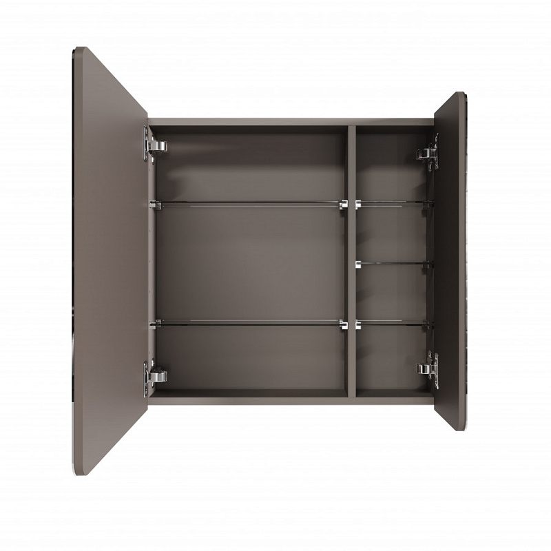 Зеркальный шкаф выполнен из влагостойкой ЛДСП: корпус выполнен из ЛВДСП в цвете кашемир, а фасад из ЛВДСП, покрытый зеркальным полотном. Фасад зеркального шкафа имеет закругленные углы, что повторяет стилистику Ар-деко и мягкие плавные закругления на раковине. Внутреннее пространство разделено на две половины, в каждой из которой есть регулируемые полочки из затемненного стекла для хранения. Эти полочки также установлены на специальных держателях, что предотвращает опрокидывание предметов. Открывание за фасад позволяет быстро добраться до необходимых вещей, а благодаря петлям с доводчиками обеспечивается плавное закрывание, что гарантирует бесшумность и комфорт использования мебели.