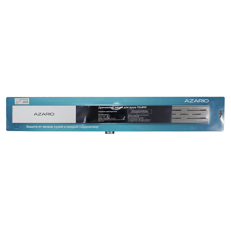 Душевой желоб AZARIO 800 мм гидрозатвор с горизонтальным выходом D40 (переходник D50) и решеткой - идеальное решение для эффективного сбора, и отведения жидкости в канализацию с поверхности пола. Они предназначены для монтажа в ванных комнатах, душевых, санузлах квартир, загородных домов и общественных местах.