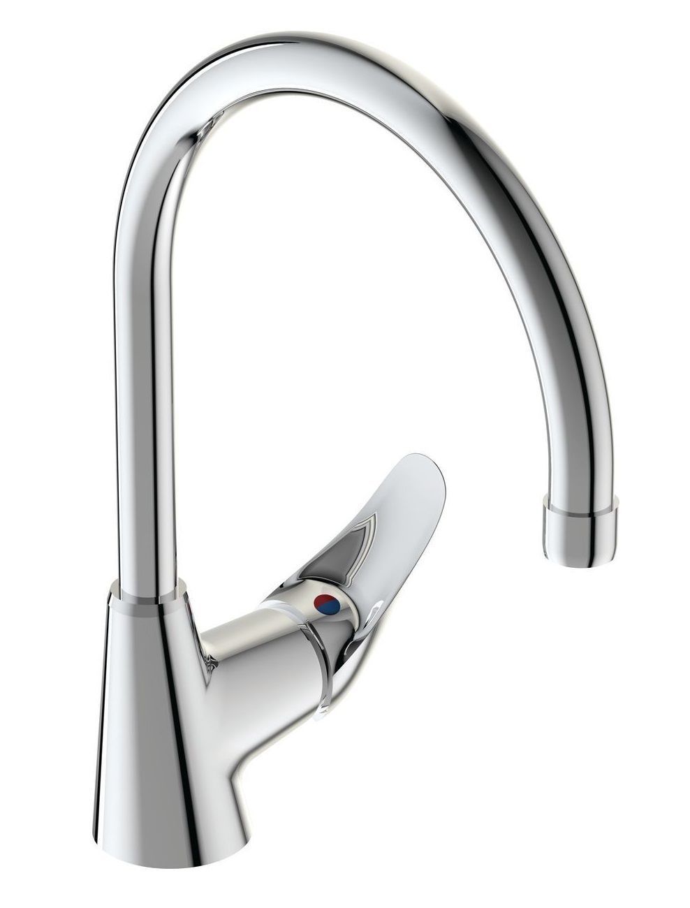 ORION Смеситель для кухонной мойки, система монтажа EASY-FIX (облегченный монтаж), трубчатый поворотный излив 200 мм, тип R, угол поворота 360˚, аэратор Perlator, керамический картридж 35 мм, металлическая рукоятка с индикаторами горячей / холодной воды, подводка гибкая G1/2", шланги стандартной длины 400 мм, дополнительная пластиковая монтажная накладка для лучшей установки на стальной мойке