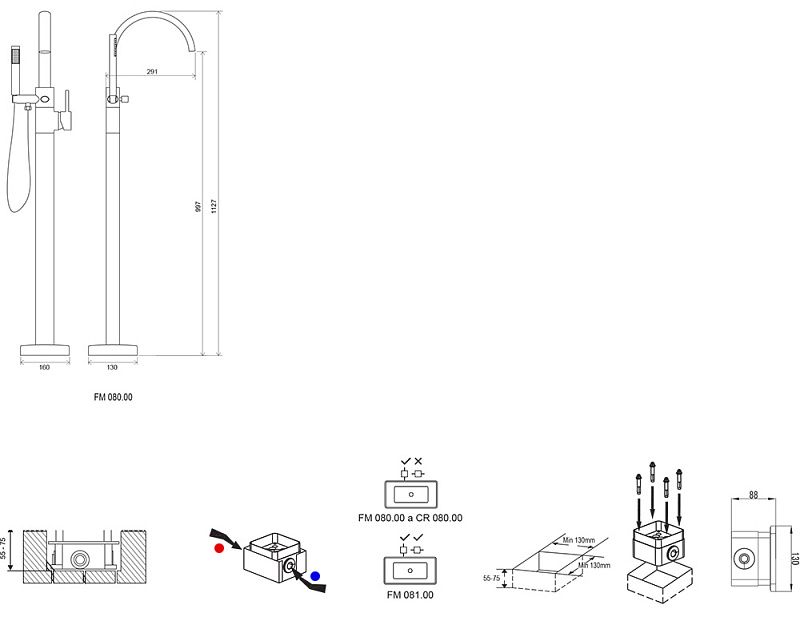 —Смеситель для ванны Ravak FM 080.00, напольный, однорычажный, с душевой лейкой, хром (X070059)