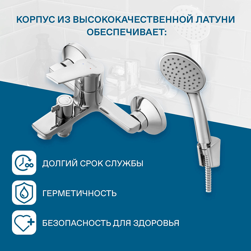 - поворортный керамический переключатель ванна/душ: надежное и удобное переключение режимов потока воды независимо от давления в системе водопровода;