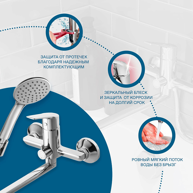 - поворортный керамический переключатель ванна/душ: надежное и удобное переключение режимов потока воды независимо от давления в системе водопровода;