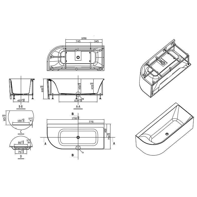 Ванна акриловая Azario Mist B 1700x750x600 пристенная, правосторонняя, в комплекте с сифоном и металлической рамой (AZ-8649-B-1.7)