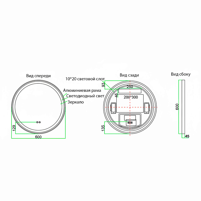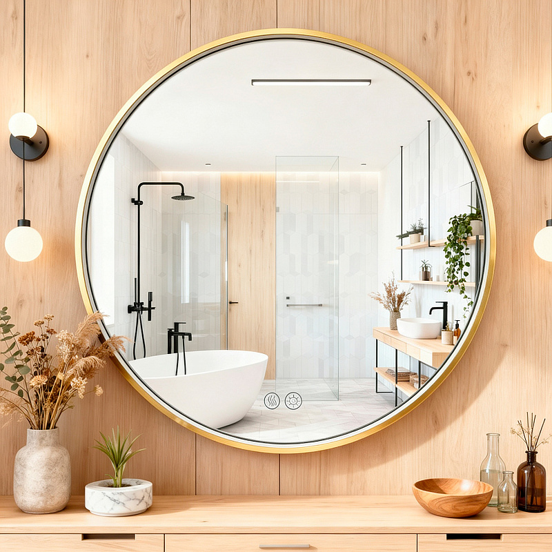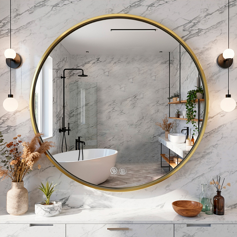 •    Алюминиевый корпус золотого матового цвета: Прочный и стильный алюминиевый корпус обеспечивает долговечность и придает зеркалу элегантный, современный вид.